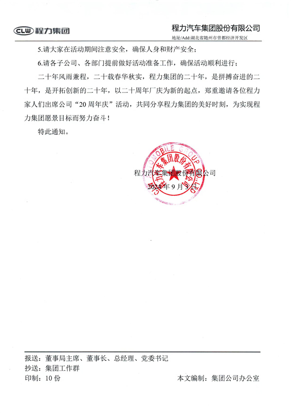 關(guān)于程力集團(tuán)二十周年廠慶的通知 尊敬的程力家人們: 時(shí)光荏苒,歲月如梭。在這個(gè)秋高氣爽,充滿希望與收獲的季節(jié)里,程力集團(tuán)即將迎來(lái)二十周年廠慶,為了慶祝這一具有重大意義的時(shí)刻,集團(tuán)公司決定舉辦一系列豐富多彩的慶典活動(dòng),活動(dòng)詳情如下: 一、活動(dòng)時(shí)間 9月15日(全天),8:30-23:58。 二、活動(dòng)地點(diǎn) 曾都經(jīng)濟(jì)開(kāi)發(fā)區(qū)程力集團(tuán)(新廠)程力大舞臺(tái) ![]() 三、活動(dòng)內(nèi)容 1.舉辦盛大的慶祝儀式,回顧程力集團(tuán)二十年的發(fā)展歷程,表彰為集團(tuán)發(fā)展做出突出貢獻(xiàn)的員工; 2.開(kāi)展新LOGO、廠歌發(fā)布,展示程力集團(tuán)的新品牌和企業(yè)文化; 3.邀請(qǐng)專家學(xué)者舉辦專用汽車專題報(bào)告和新能源、應(yīng)急裝備、國(guó)際貿(mào)易分論壇,探討專用汽車行業(yè)的發(fā)展趨勢(shì)和未來(lái)前景; 4.組織員工文藝匯演,展現(xiàn)程力人的風(fēng)采和精神風(fēng)貌。 四、注意事項(xiàng) 1.憑票入場(chǎng); 2.參會(huì)人員上午統(tǒng)一著20周年藍(lán)色T恤衫入場(chǎng),參加晚會(huì)的,統(tǒng)一著20 周年紀(jì)念版白色T恤衫入場(chǎng)參與晚會(huì)互動(dòng); 3.參加活動(dòng)的人員請(qǐng)遵守活動(dòng)現(xiàn)場(chǎng)的秩序,聽(tīng)從工作人員的安排,遵守會(huì)場(chǎng)的紀(jì)律; 4.參會(huì)人員不得中途退場(chǎng); 5.請(qǐng)大家在活動(dòng)期間注意安全,確保人身和財(cái)產(chǎn)安全; 6.請(qǐng)各子公司、各部門提前做好活動(dòng)準(zhǔn)備工作,確保活動(dòng)順利進(jìn)行; 二十年風(fēng)雨兼程,二十載春華秋實(shí),程力集團(tuán)的二十年,是拼搏奮進(jìn)的二十年,是開(kāi)拓創(chuàng)新的二十年,以二十周年廠慶為新的起點(diǎn),鄭重邀請(qǐng)各位程力家人們出席公司“20周年慶”活動(dòng),共同分享程力集團(tuán)的美好時(shí)刻,為實(shí)現(xiàn)程力集團(tuán)愿景目標(biāo)而努力奮斗! 特此通知。 ![]() ![]() |